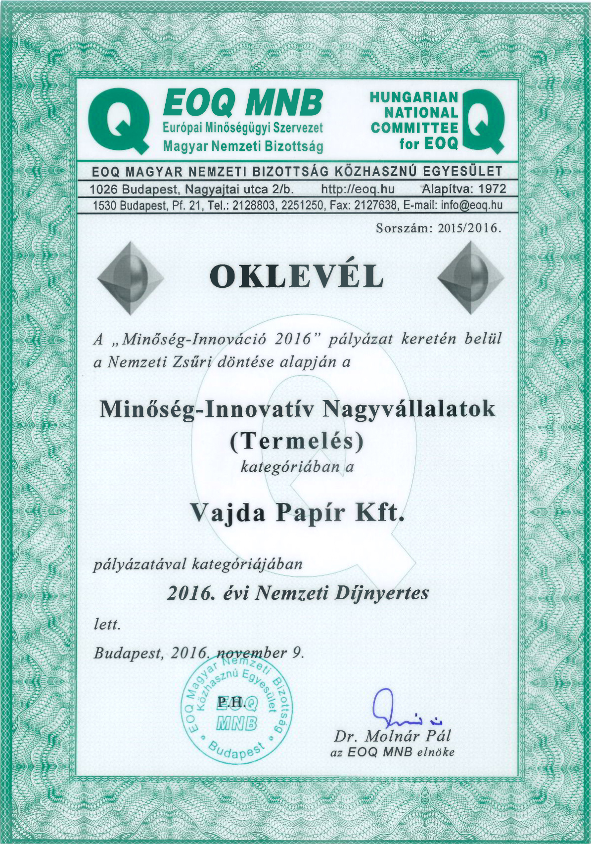 A hazai környezetben megvalósult minőség-innováció pályázatok között 2016. évi Nemzeti Díjnyertes lett Vállalatunk a Minőség-Innovatív Termelő Nagyvállalat kategóriában. A díj az egész vállalat minőségorientált és innovatív működését elismerő díj. A bemutatott és alkalmazott „Easy Open és Open & Close” megoldásainkkal, valamint az elismeréssel tovább erősítjük elköteleződésünket a folyamatos fejlődés, a fogyasztói igények minél magasabb színvonalú kielégítése és az innovatív, előremutató technológiák használata iránt.