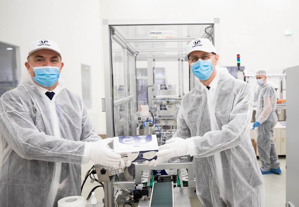 Több mint 1,4 milliárd forintos beruházással nagy teljesítményű maszkgyártó gépet állított üzembe a magyar piacon higiéniai papírtermékek gyártásában piacvezető Vajda-Papír Kft. Dunaföldváron. Az új gépsor átadásakor Varga Mihály pénzügyminiszter egyebek mellett méltatta, hogy Magyarország újabb területen vált képessé az önellátásra. Az 1,4 milliárd forintos beruházás 1,045 milliárd forintos kormányzati támogatás mellett valósult meg. Vajda Attila, a 100 százalékban magyar tulajdonú Vajda-Papír Kft. ügyvezető igazgatója pedig azt hangsúlyozta: az új beruházással biztosítható, hogy nem csak alapvető higiéniai papírtermékekből, de maszkokból sem lesz hiány Magyarországon, még a koronavírus-járvány alatt megnövekedett kereslet mellett sem.